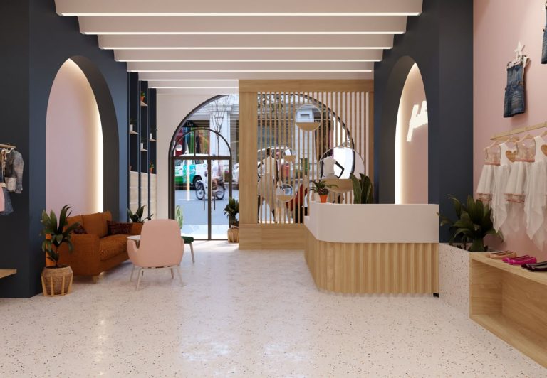 در این بوتیک، برای ایجاد فضایی خاص و متمایز از رنگهای گرم و عمیق مانند سرمهای، صورتی ملایم و جزئیات طلایی استفاده شده است. ترکیب این رنگها حس لوکس و مدرن را القا میکند و محیطی آرامشبخش و جذاب برای مشتریان فراهم کرده است.